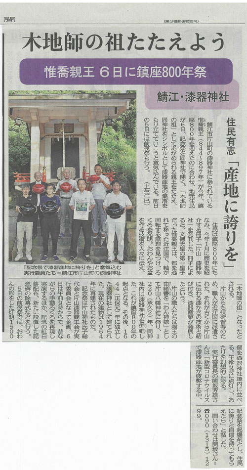 木地師の祖 鯖江・漆器神社(片山町)惟喬親王鎮座800年