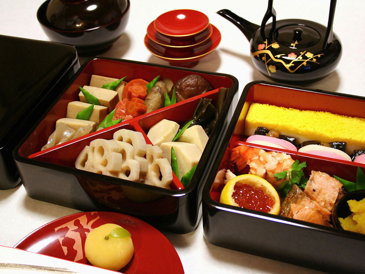: 三段の重箱におせち料理を盛り付けて