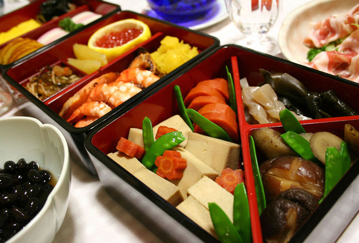 三段の重箱におせち料理を盛り付けて